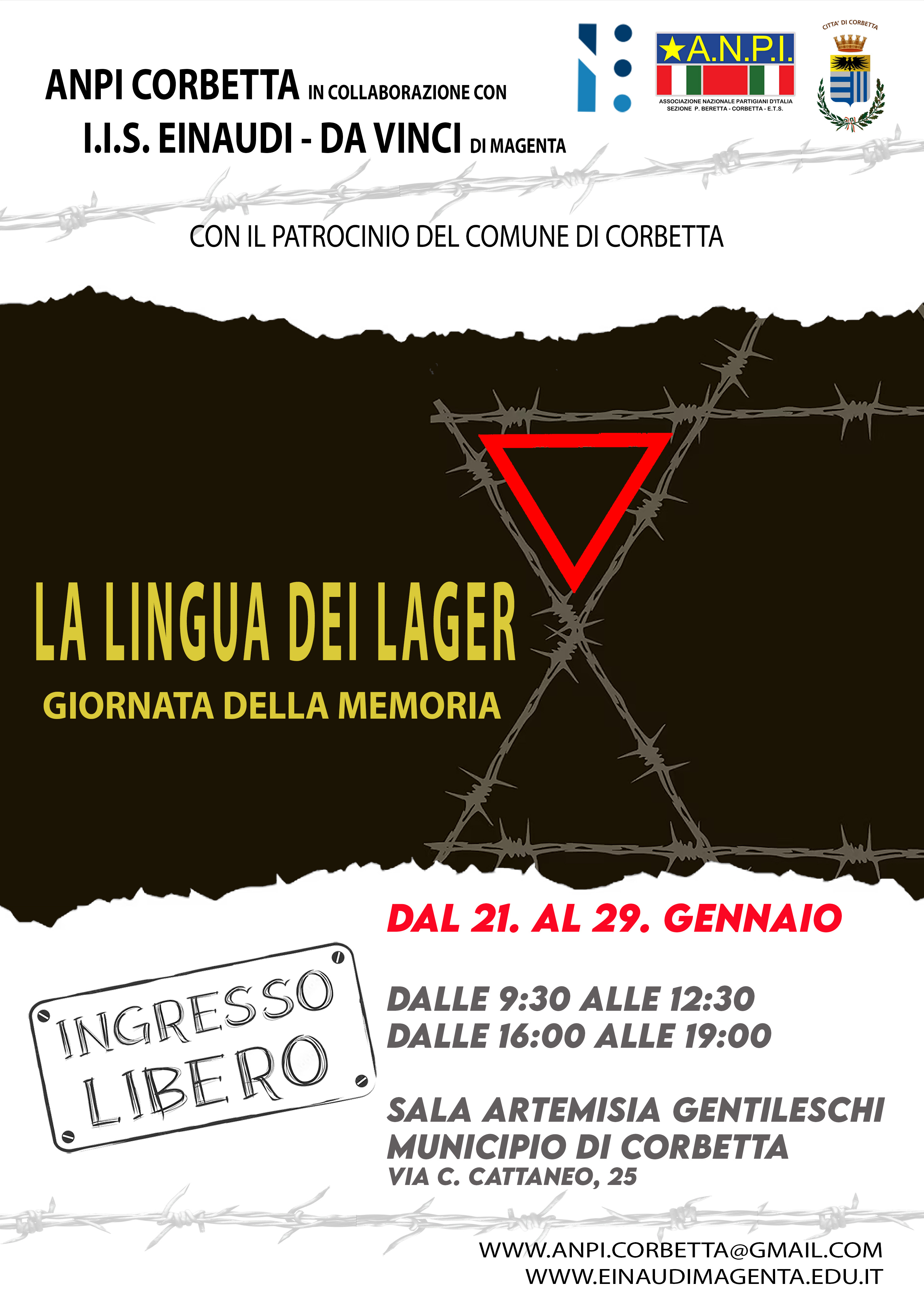In occasione della “Giornata della Memoria”, anche quest’anno il nostro Istituto ha voluto rinnovare il proprio impegno civile collaborando, per il secondo anno consecutivo, con la sezione ANPI di Corbetta. Tale sinergia ha permesso la realizzazione di una serie di installazioni ed elaborati artistici incentrati sul tema della memoria, riuniti nella mostra dal titolo "LA LINGUA DEI LAGER". L’esposizione, a ingresso gratuito, si terrà a Corbetta presso la Sala Comunale “Artemisia Gentileschi” dal 21 al 29 gennaio, secondo gli orari indicati nella locandina allegata alla presente.